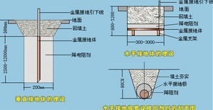 最后應該指出的是:上述施工方式是對一般工程而言;對一些大型或尖端技術工程常常要用大型網格狀地網,甚至使用貴金屬組成地網,這時可在原設計的地網中的金屬接地體周圍按下圖(垂直接地體的埋設)或下圖(水平接地體的埋設)的方法施用降電阻劑、既能滿足降阻的要求。